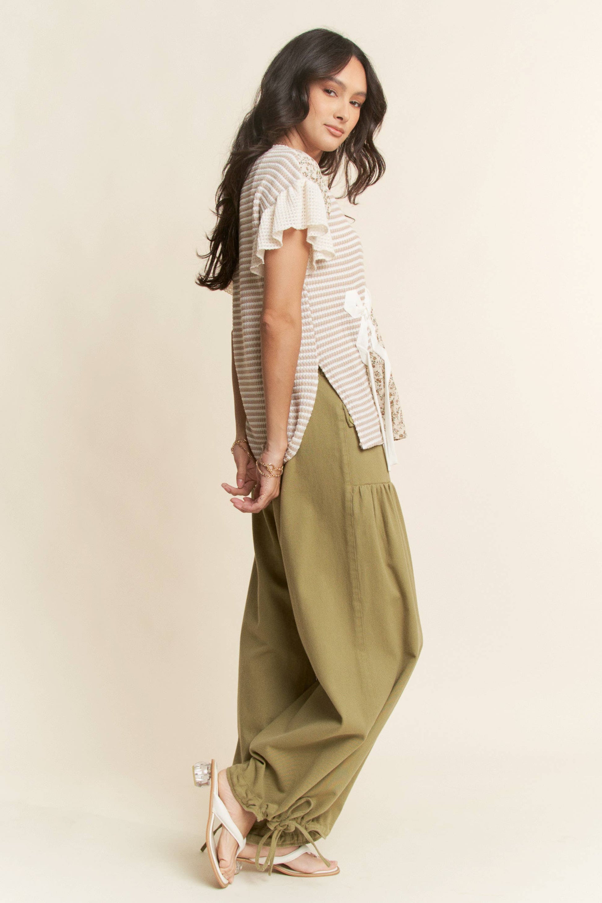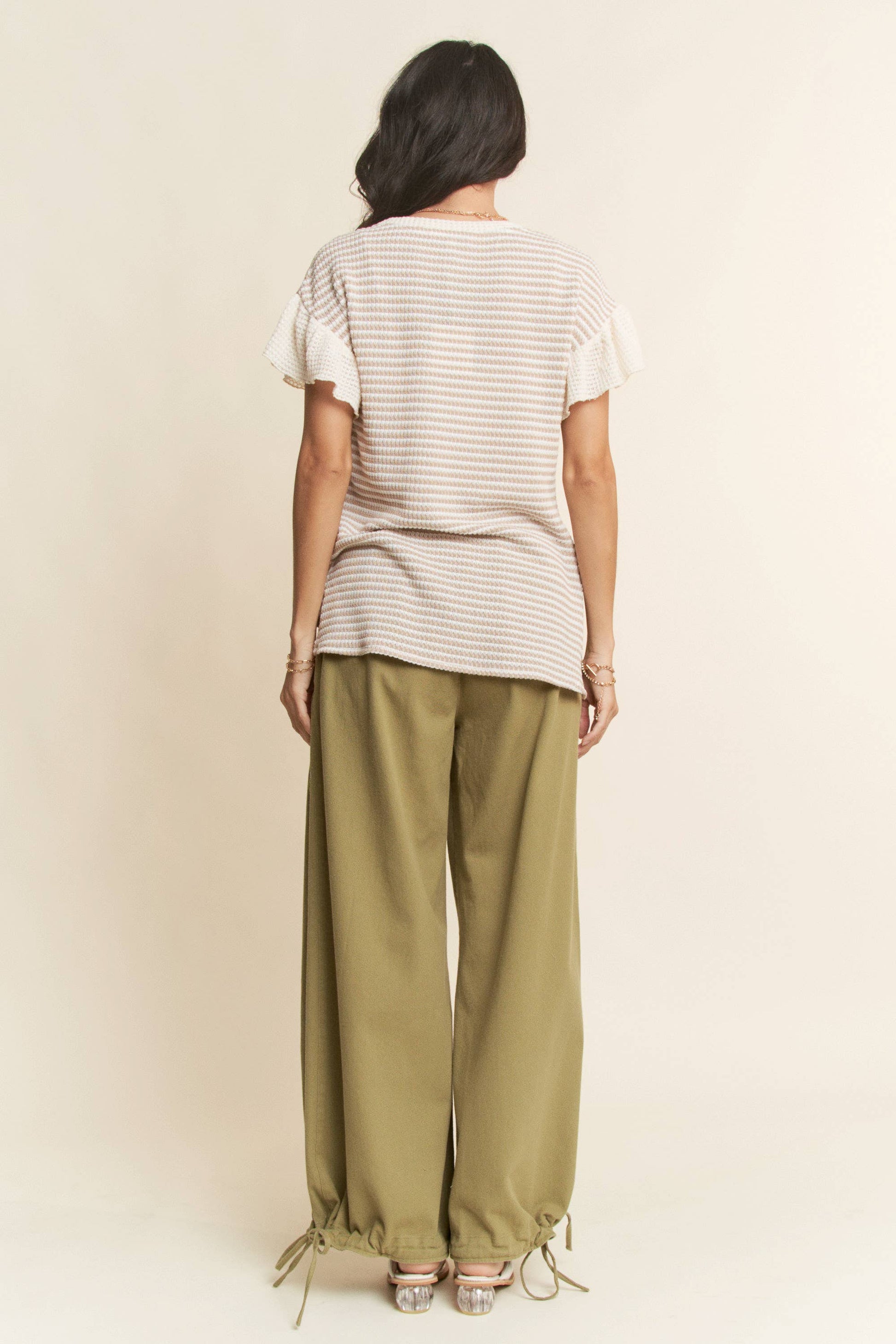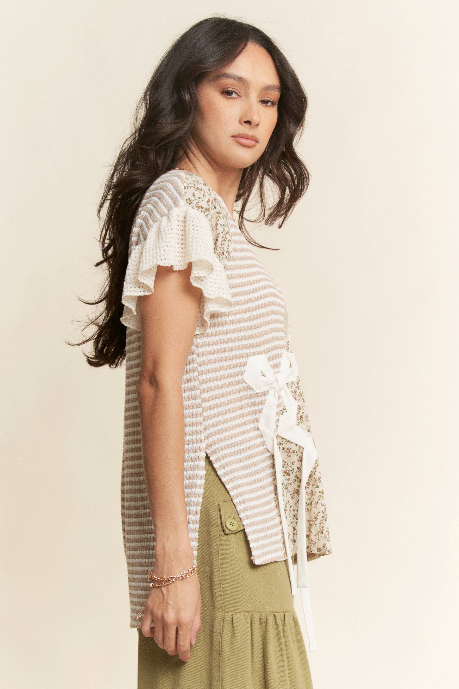BOW TRIM WAFFLE KNIT COLOR BLOCK SHORT SLEEVE TOP: TAUPE MOCHA / S