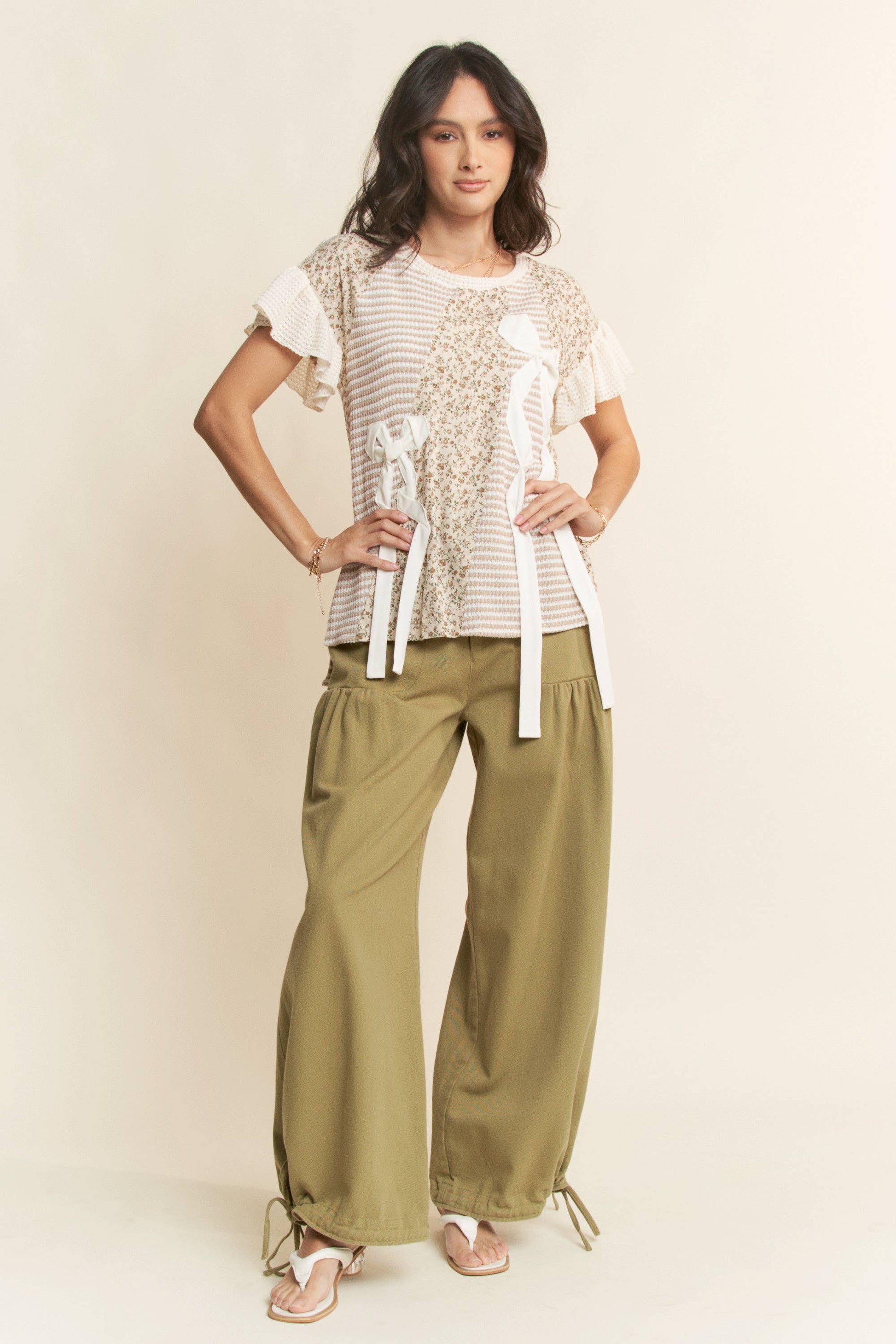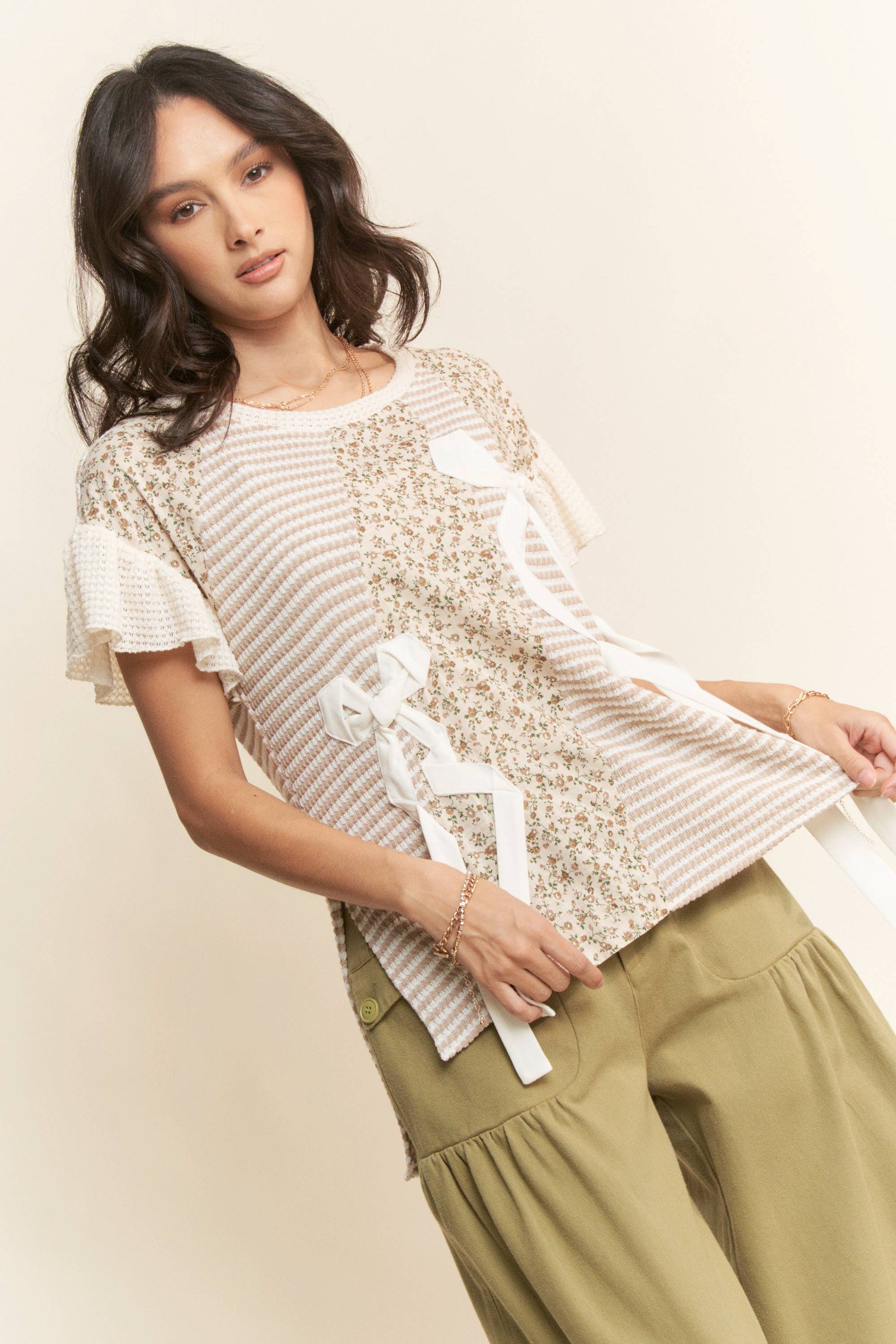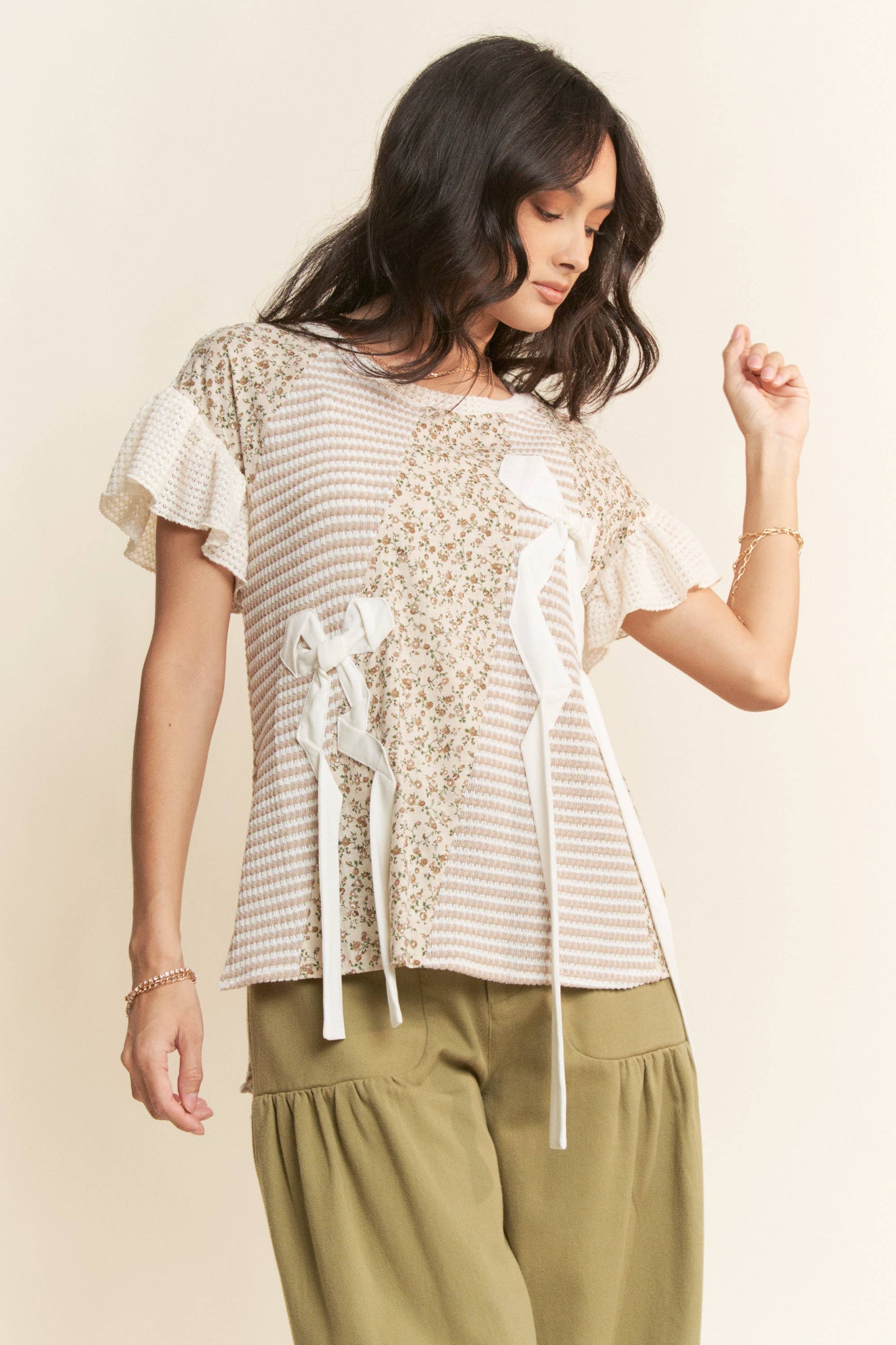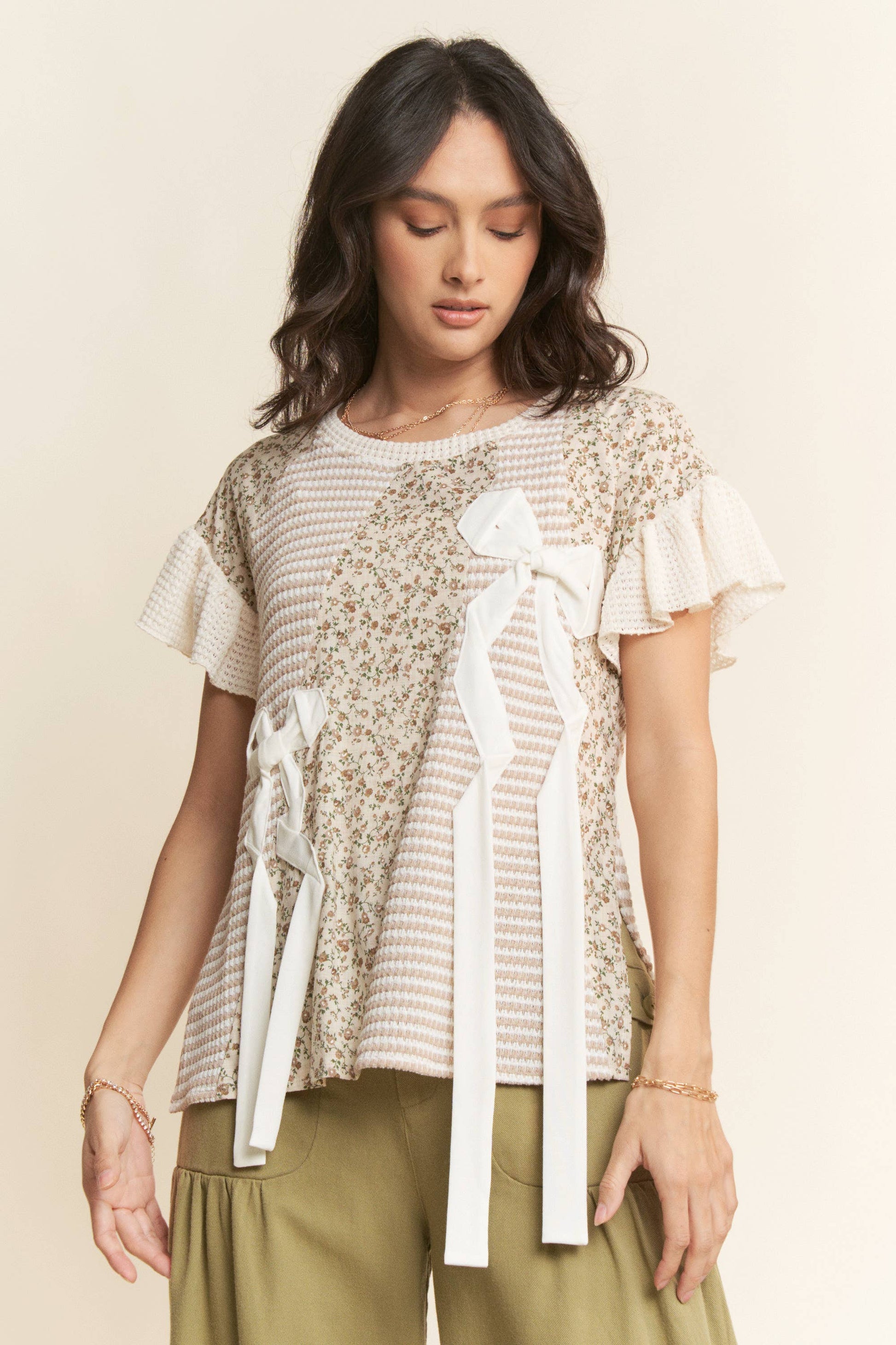 WAFFLE KNIT DITSY PRINT COMBINATION RIBBON DETAIL SHORT SLEEVE TOP