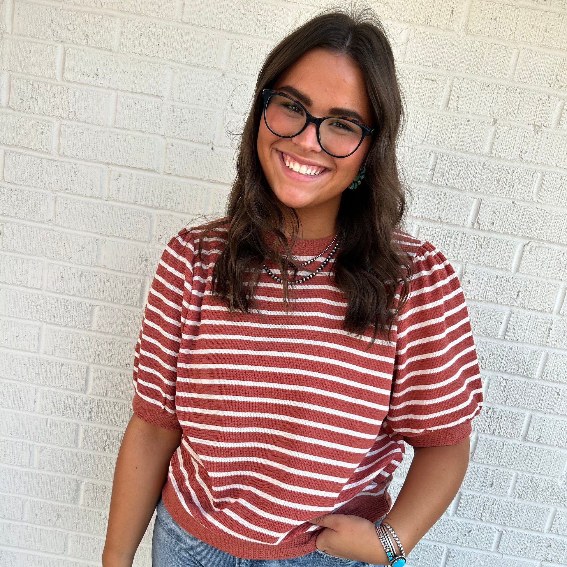 Soft and stylish, this cloudy knit top features puffy sleeves, stripe contrast detail, and a classic round neckline for an effortless look.