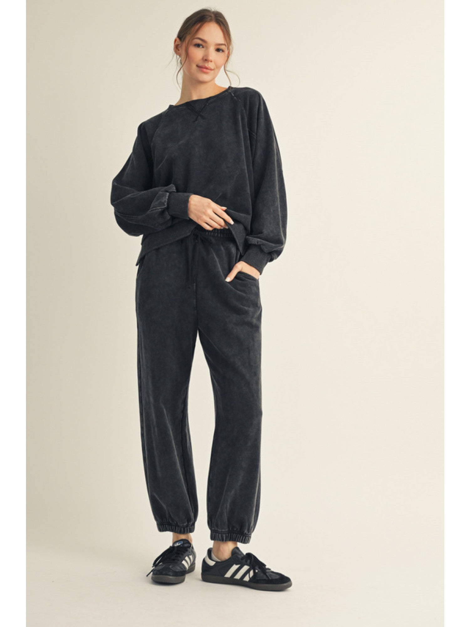 Garment washed casual sweatshirt & jogger pants sets, v-notched neck, drawstring waist, side pockets.