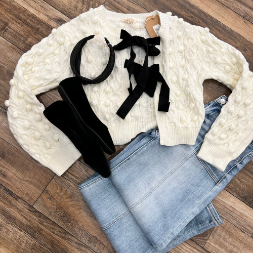 Chic and charming, this cream knit cardigan features a delicate bow tie closure, adding a touch of elegance to your cozy ensemble.