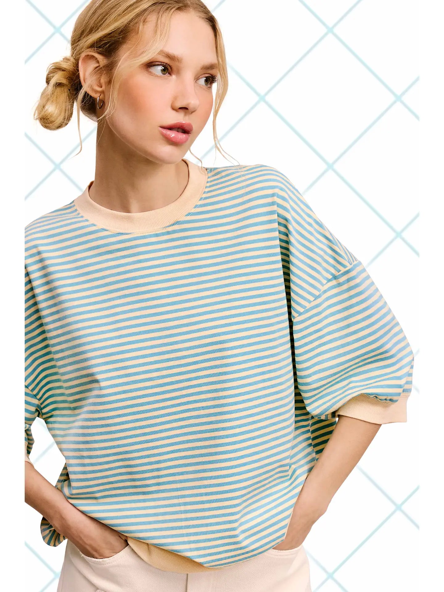 So cool and endlessly classic, this striped crewneck top features an oversized, slouchy silhouette with a timeless stripe pattern you’ll reach for again and again. Designed with a relaxed loose fit and short sleeves, it’s perfect for wearing solo or layering through the seasons. Lightweight and comfortable, this top doubles effortlessly as everyday wear or cozy loungewear.