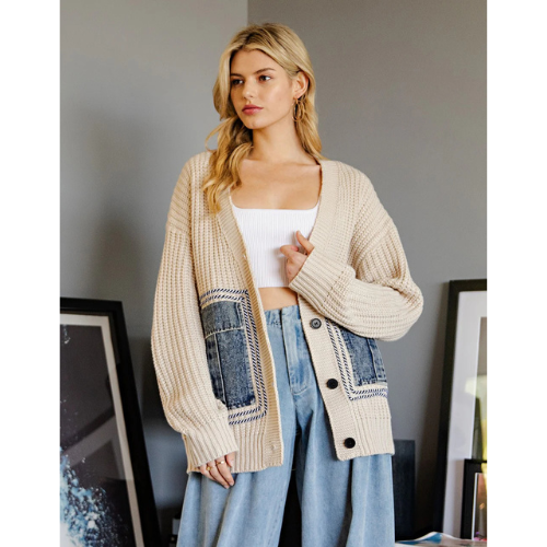 Solid knit long sleeve cardigan featuring a button down front, ribbed cuffs, contrasting denim flap pockets, added trim around the pockets for detail and is a relaxed fit perfect for any age range.