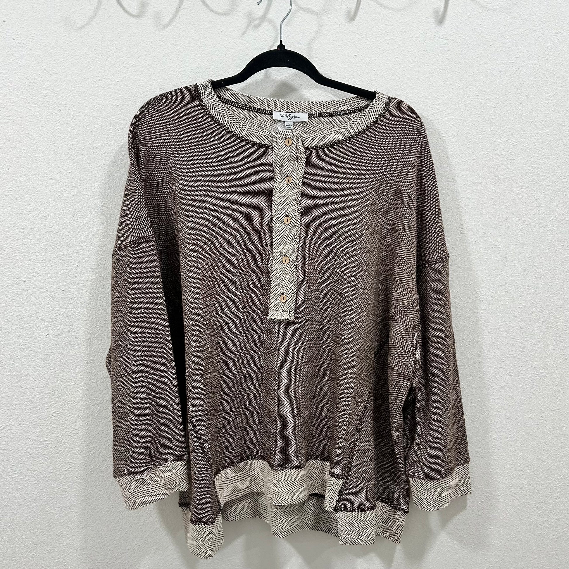 Textured long-sleeve henley top featuring contrast trim, button detail, and a laid-back silhouette—perfect for everyday comfort with a touch of casual charm. 60% Cotton / 40% Polyester