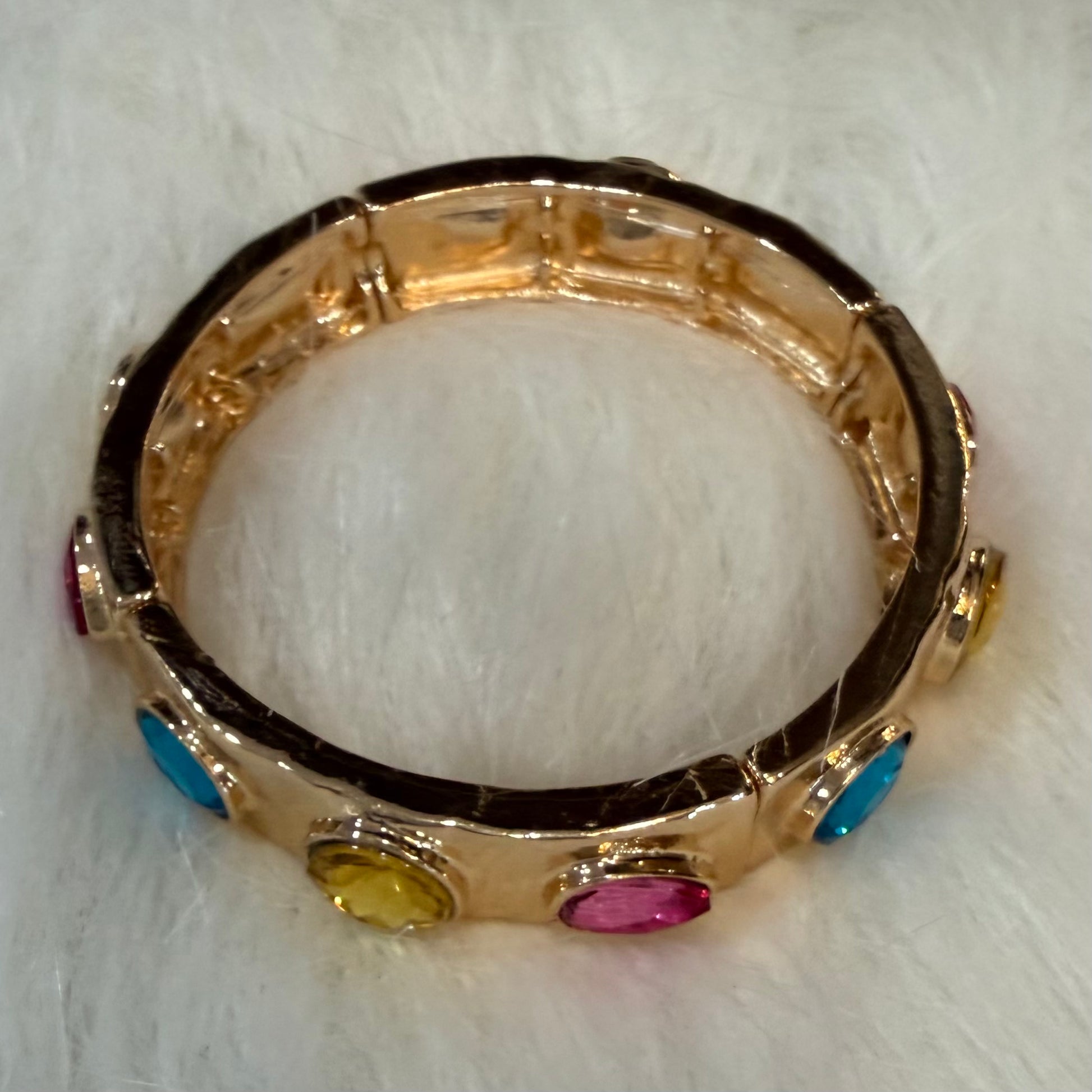 Bright and playful with just the right amount of sparkle, this gold stretch bracelet features blue, pink, and yellow rhinestones for a fun pop of color.