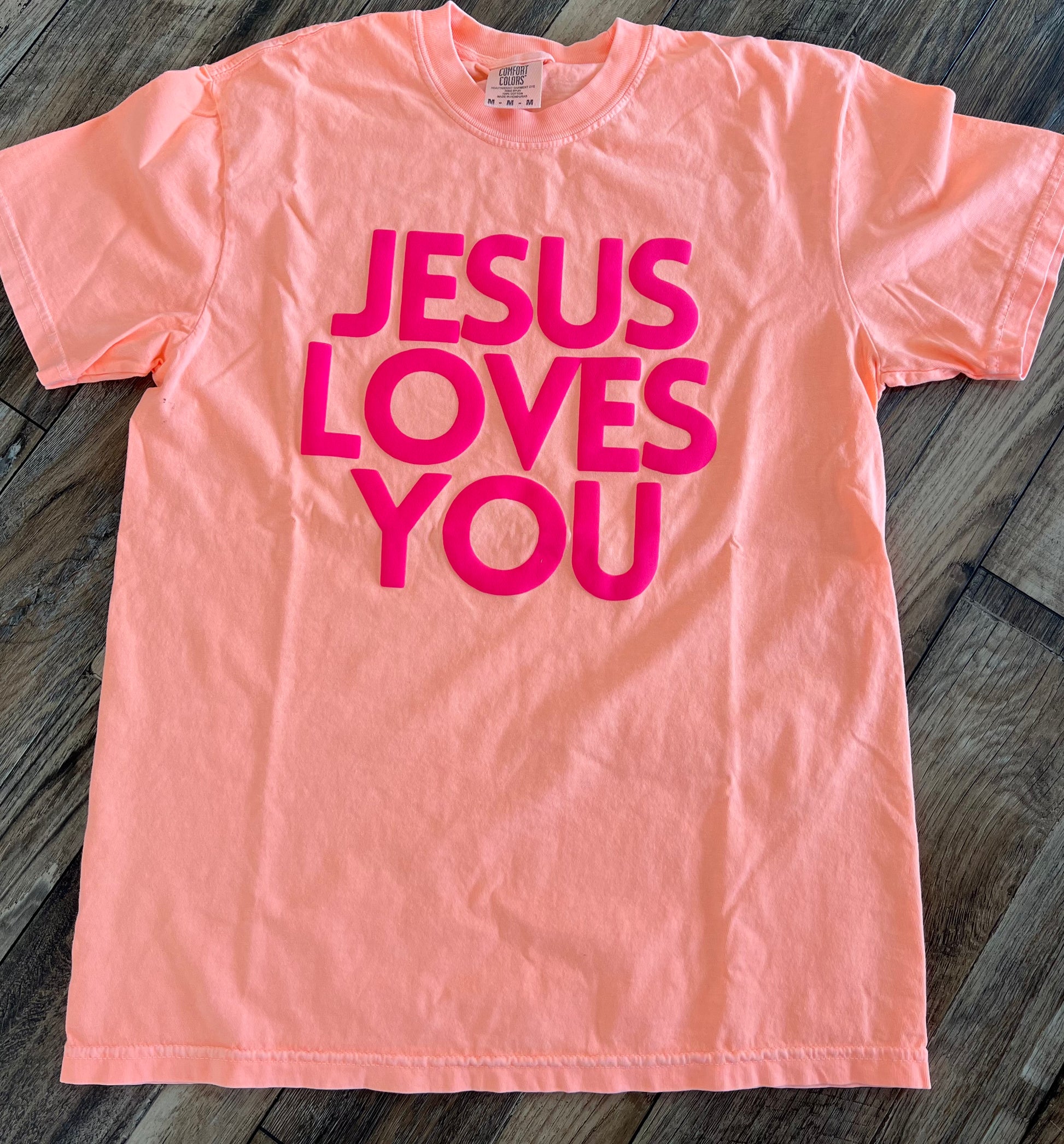 A soft, simple tee with bold puff print that says it all—Jesus Loves You. Everyday faith with a stylish touch.