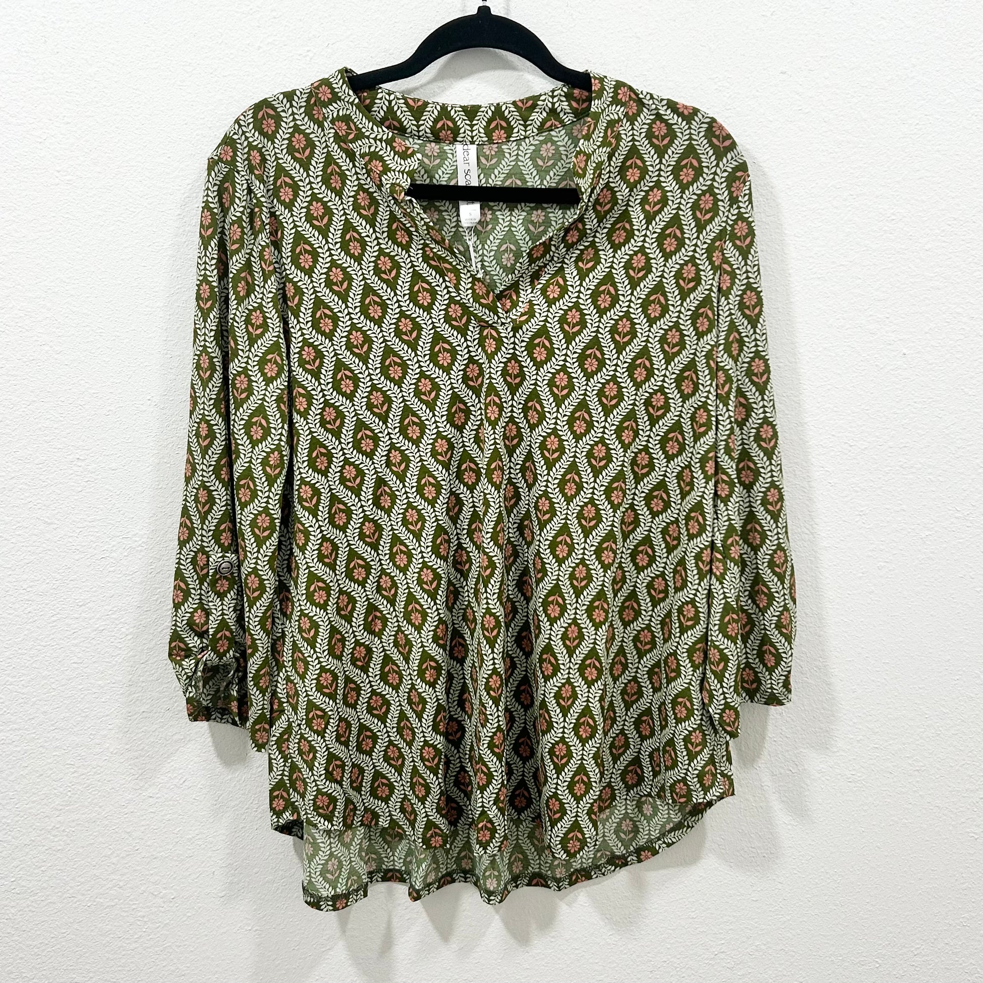 The olive green background is adorned with delicate white leafy vines and scattered soft pink flowers. Perfect for a transitional season piece.