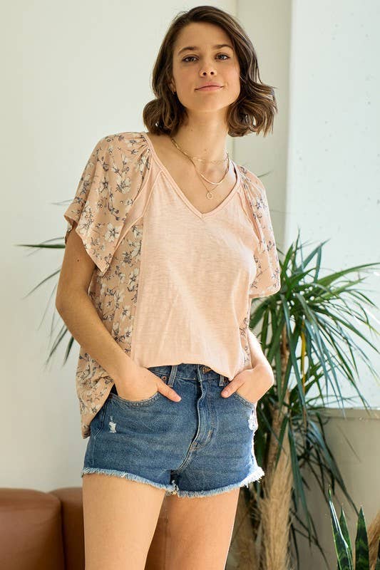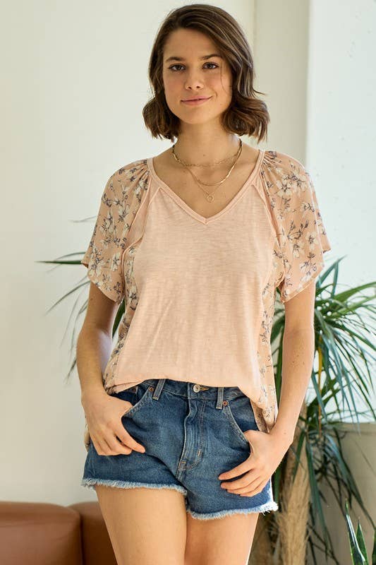 Mixed Media Ruffle Sleeve Top With Raw Edge Seams - 15159T-1: L / Peach Blossom