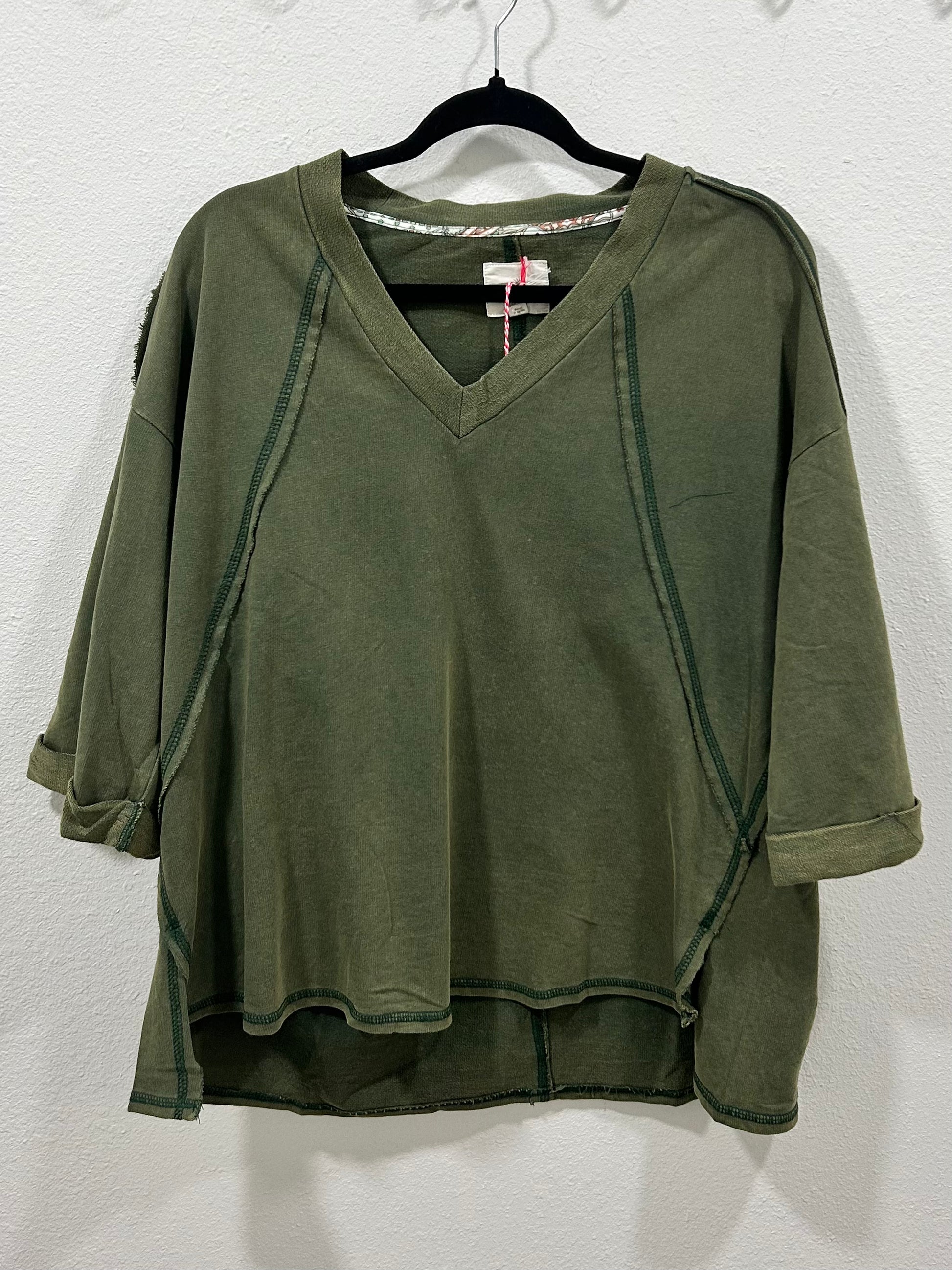A relaxed V-neck top with high-low hem and side slits, offering effortless style and all-day comfort.