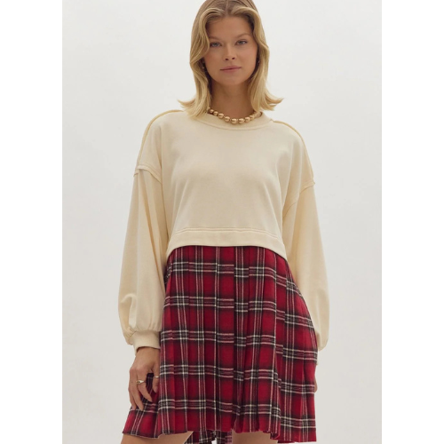 Twofer solid long sleeve mini dres featuring plaid skirt. Pockets at side. Heart detail at back. Unlined. Knit. Non-sheer. Lightweight.