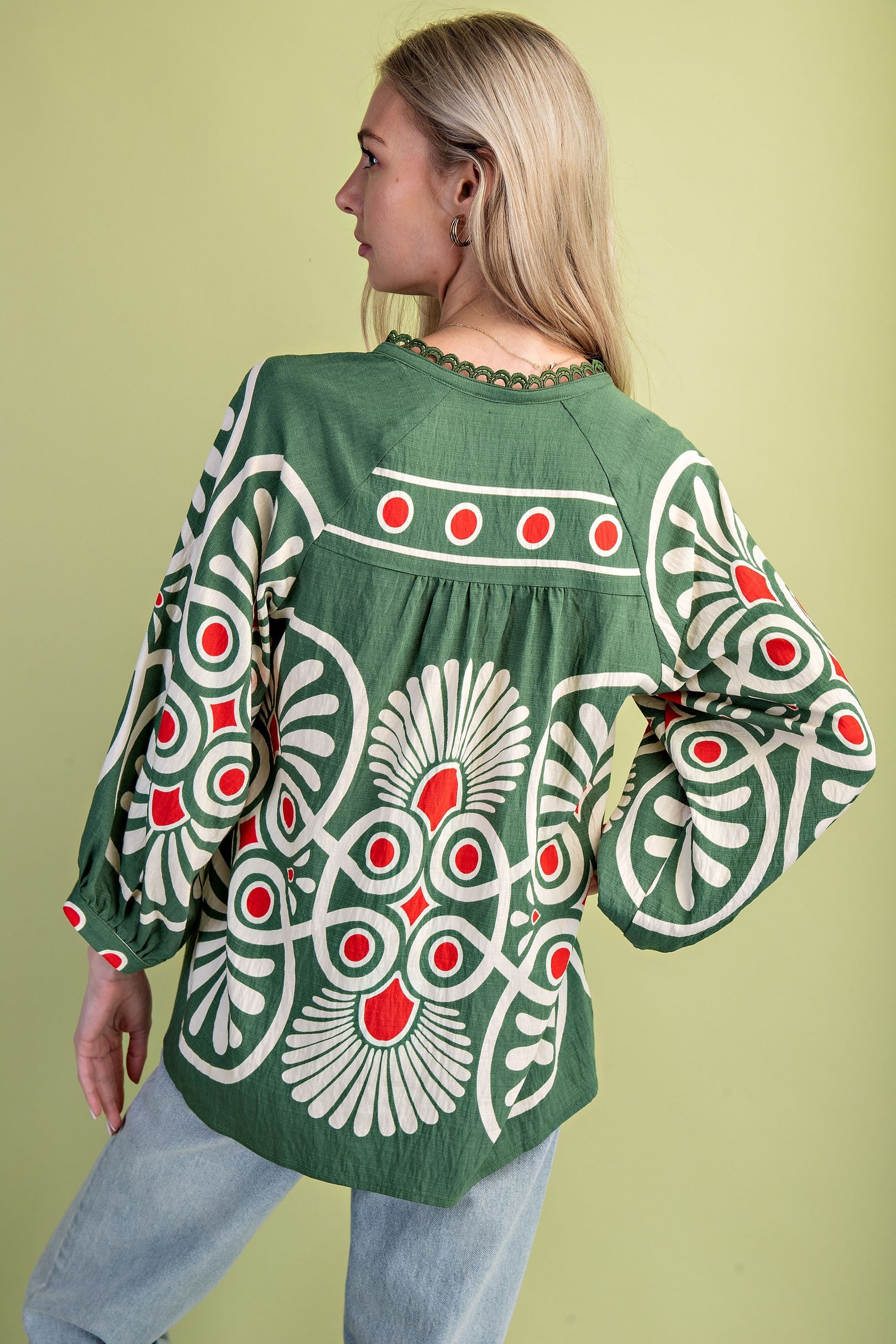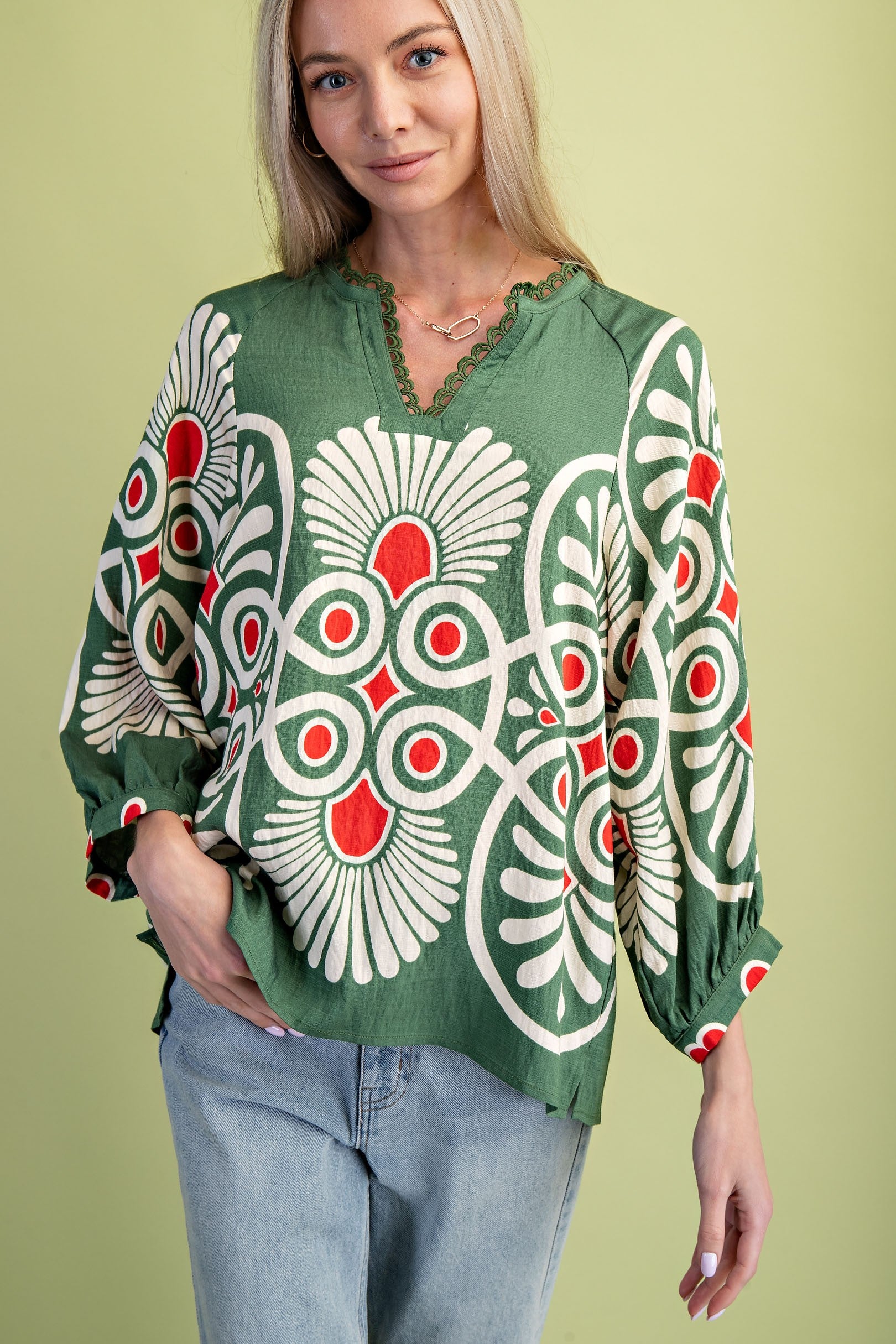 Printed notch neck top finished with delicate decorative trim for easy style.