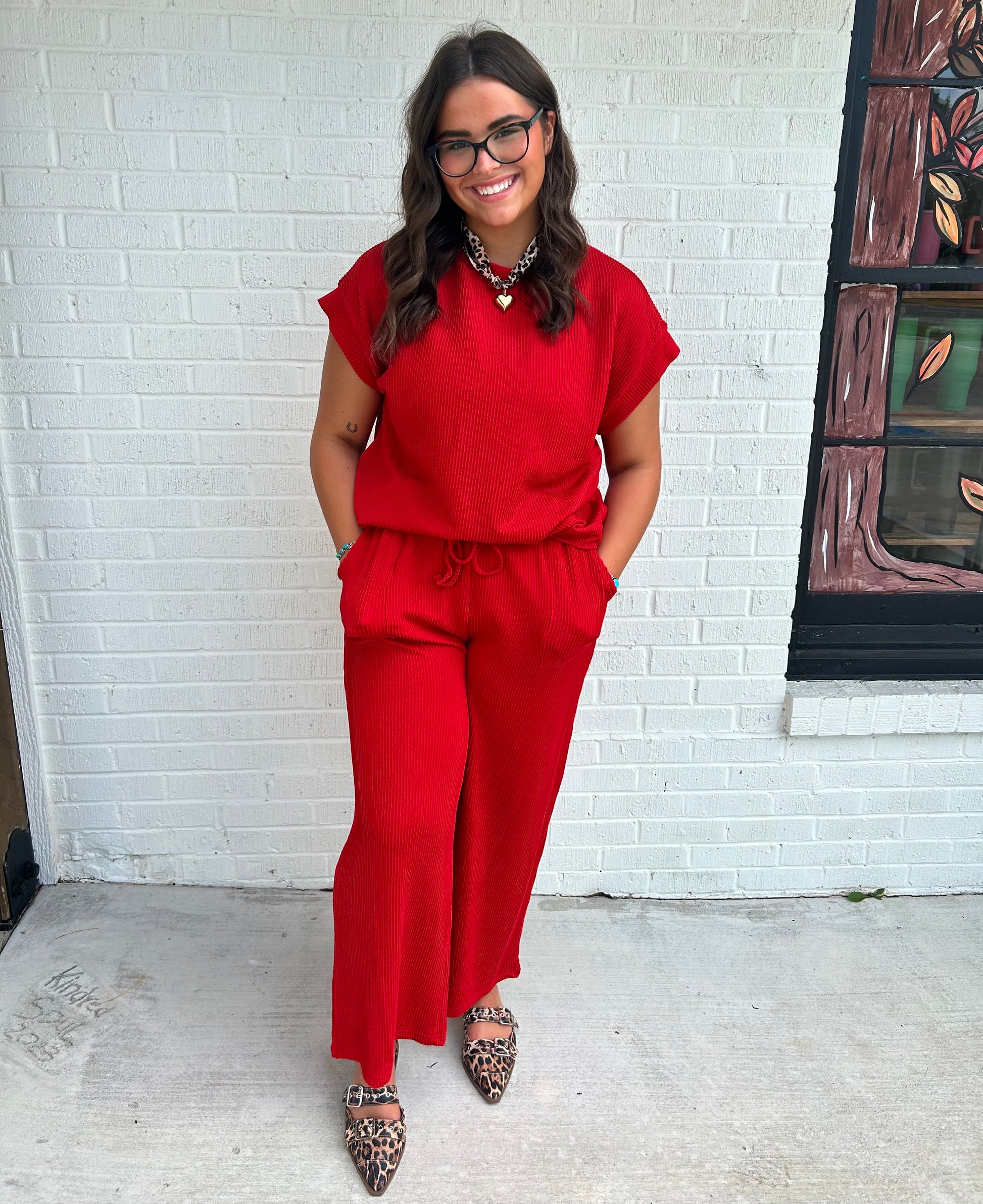 Cozy and chic, this two-piece rib knit lounge set features an oversized top with dolman sleeves and matching wide-leg pants, finished with subtle stripes and buttery-soft comfort.