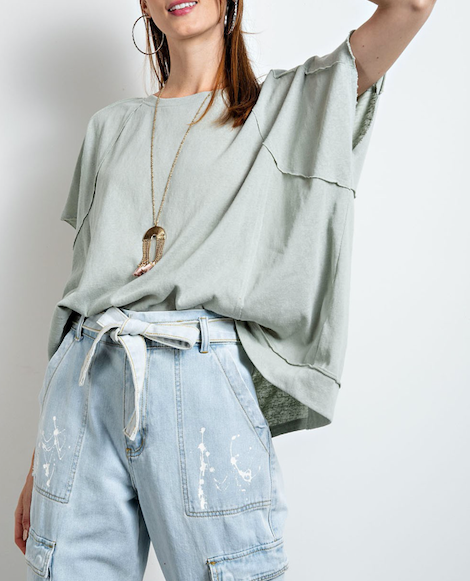 SHORT SLVS LOOSE FIT KNIT TOP -ROUNDED NECKLINE -LOOSE FIT AND SLOUCHY SILHOUETTE -EXPOSED SEAMING -MODEL HEIGHT 5'10