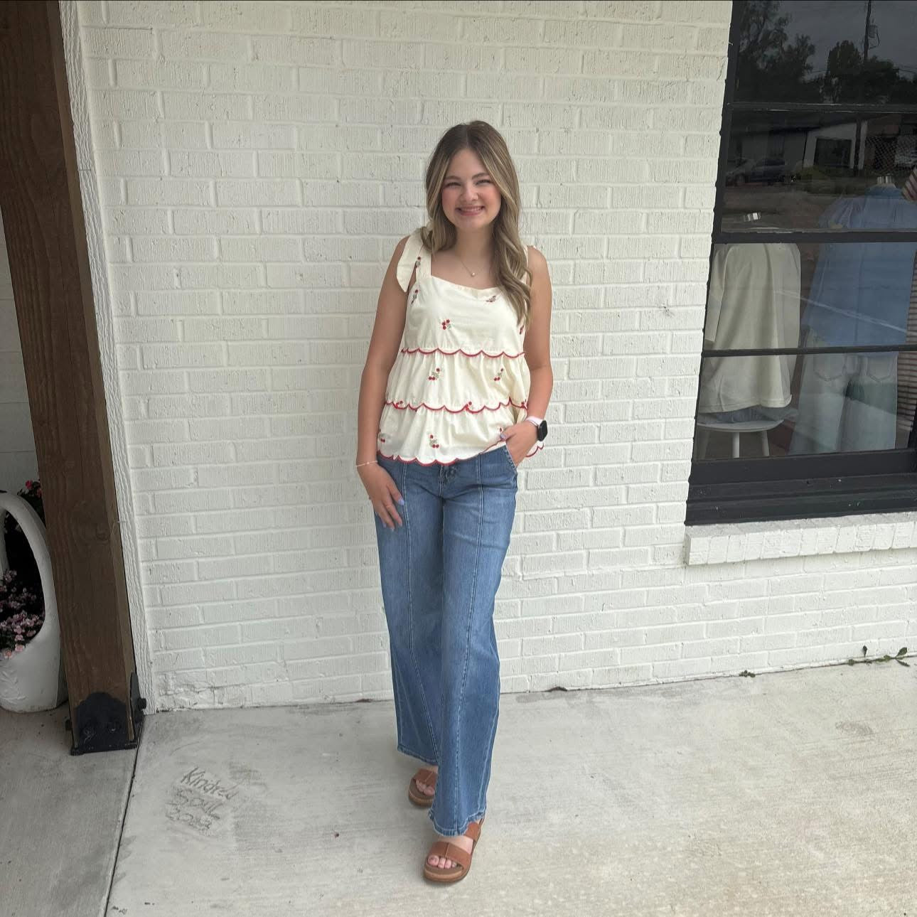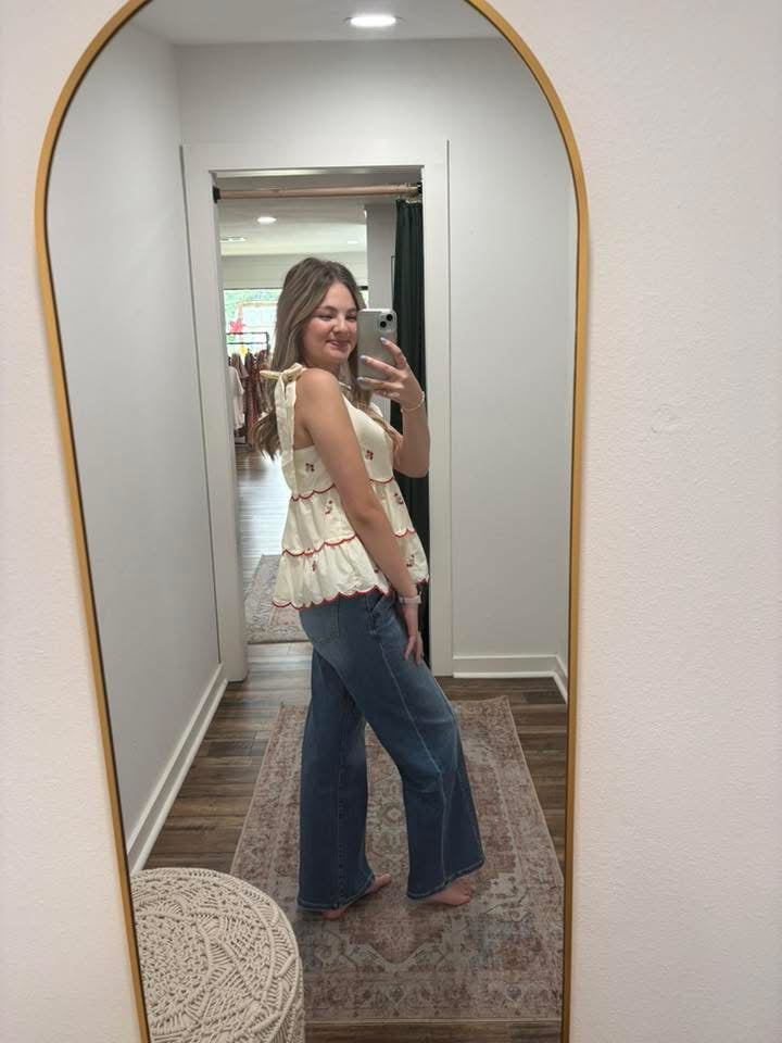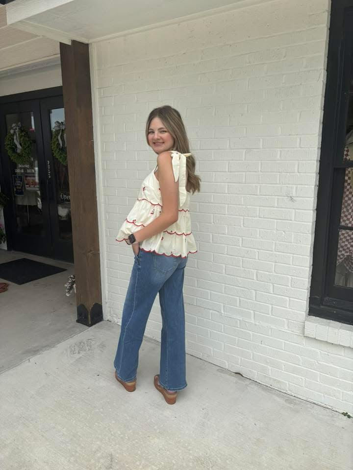 Cream woven tie shoulder, embroidered tiered two way top