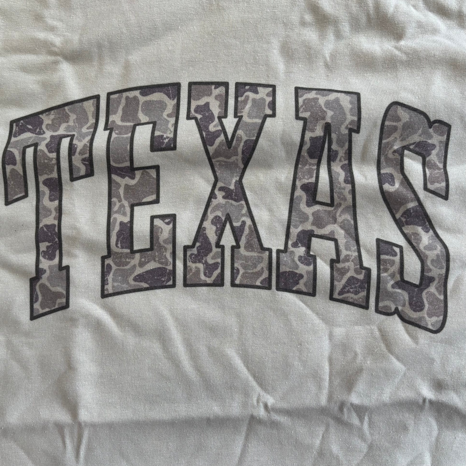 Tan tee with bold camo block letters spelling TEXAS — casual, comfy, and perfect for everyday wear.