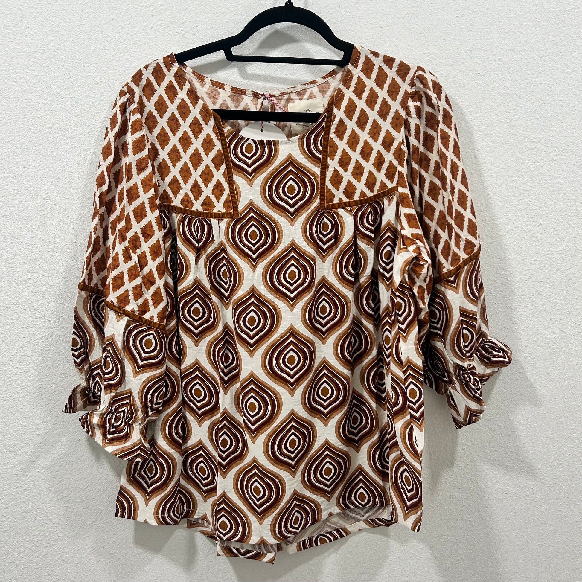 Bold and fun, this retro geometric print top adds a pop of vintage flair to any look.